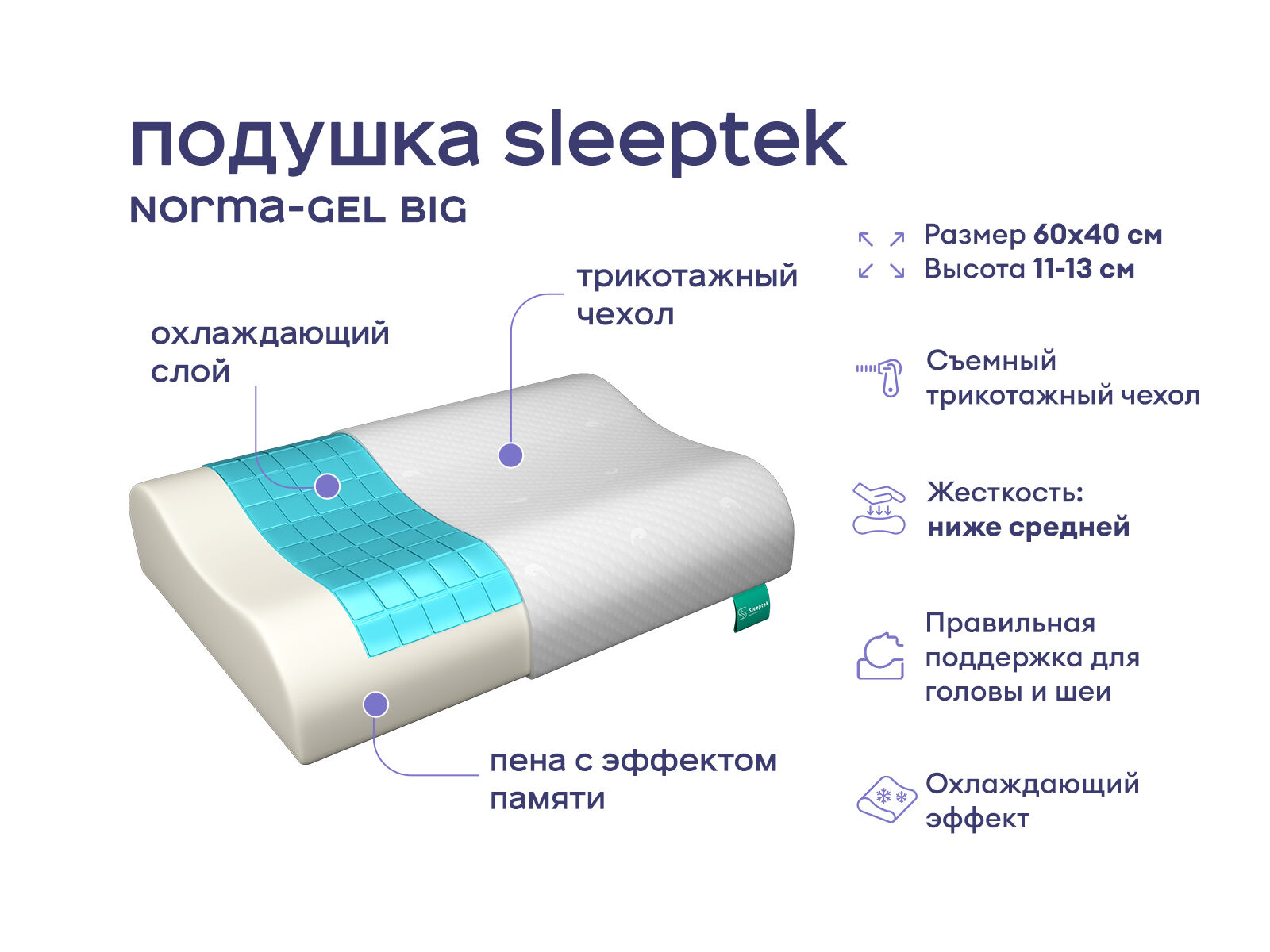 Анатомическая подушка классической прямоугольной формы. Наполнителем служит инновационная мемори – пена с эффектом памяти формы. Мемори, прогреваясь теплом тела, точно повторяет контуры головы и шеи спящего, что помогает быстро расслабить мышцы и ощутить комфортную поддержку шейного отдела. Специальный гелевый слой не дает подушке сильно нагреваться – гель обладает охлаждающим эффектом, что позитивно влияет на состояние кожи и глубину сна. Пробуждение утром будет легким и приятным, без отеков и усталости.