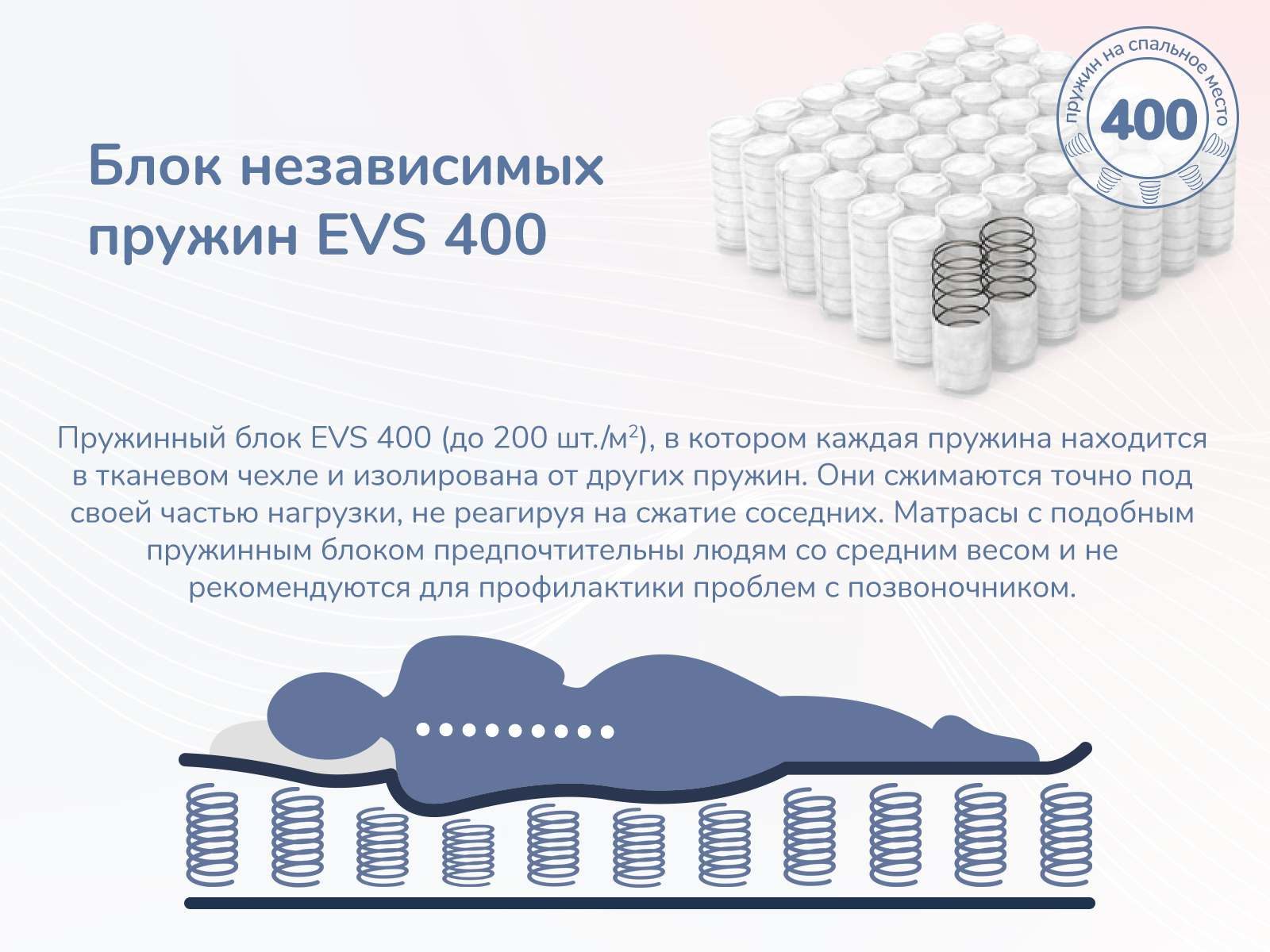 Спальное место содержит около 400 независимых пружин. Автономная работа делает все элементы своеобразными точками опоры и поддержки. В результате формируется ортопедическая подстройка матраса, которая обеспечивает здоровый и благополучный сон.