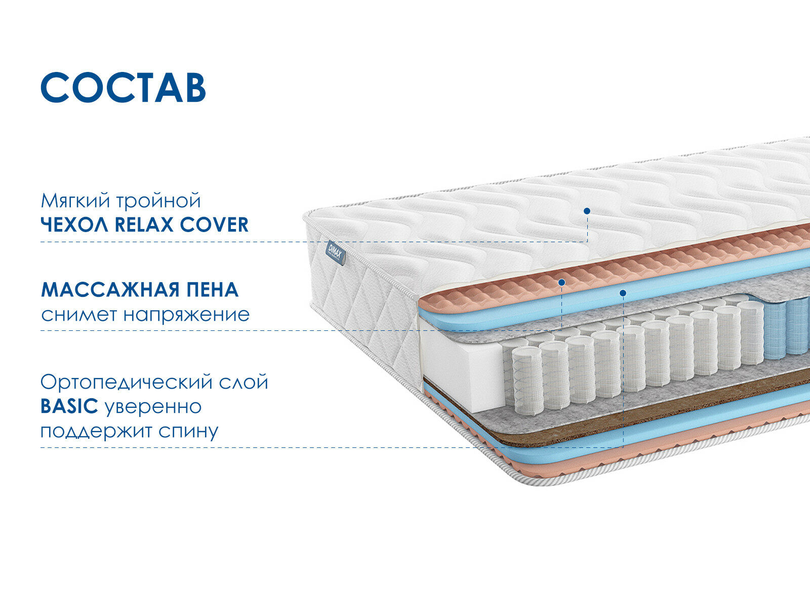 Димакс Relmas Various 3Zone – ортопедический матрас с массажным эффектом и двумя уровнями жёсткости: средней и выше среднего. Модель сочетает комфорт и поддержку, обеспечивая оптимальный отдых для вашего тела.