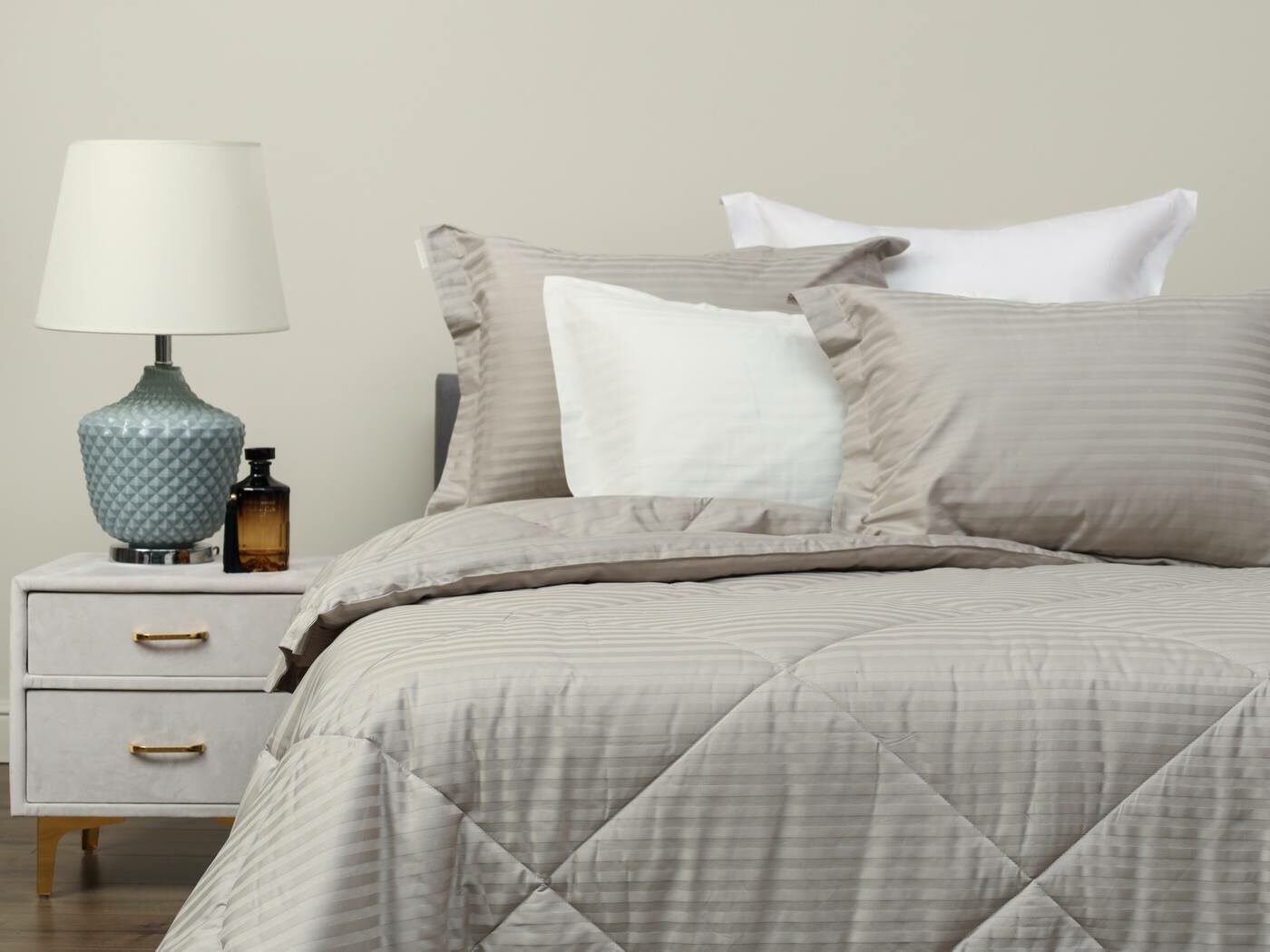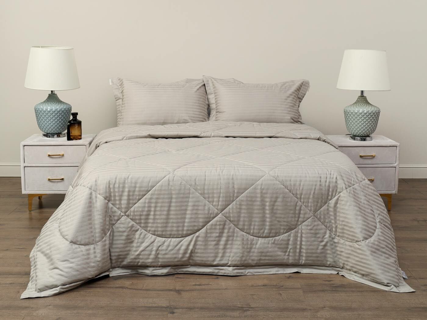 Одеяло очень удобно в использовании, легко стирается и быстро сохнет. Оно универсальное, средней толщины, что позволяет использовать его круглый год. К тому же, оно простегано элегантной стежкой, что не только придает красоты нашим комплектам, но и отлично фиксирует слой наполнителя внутри изделия.