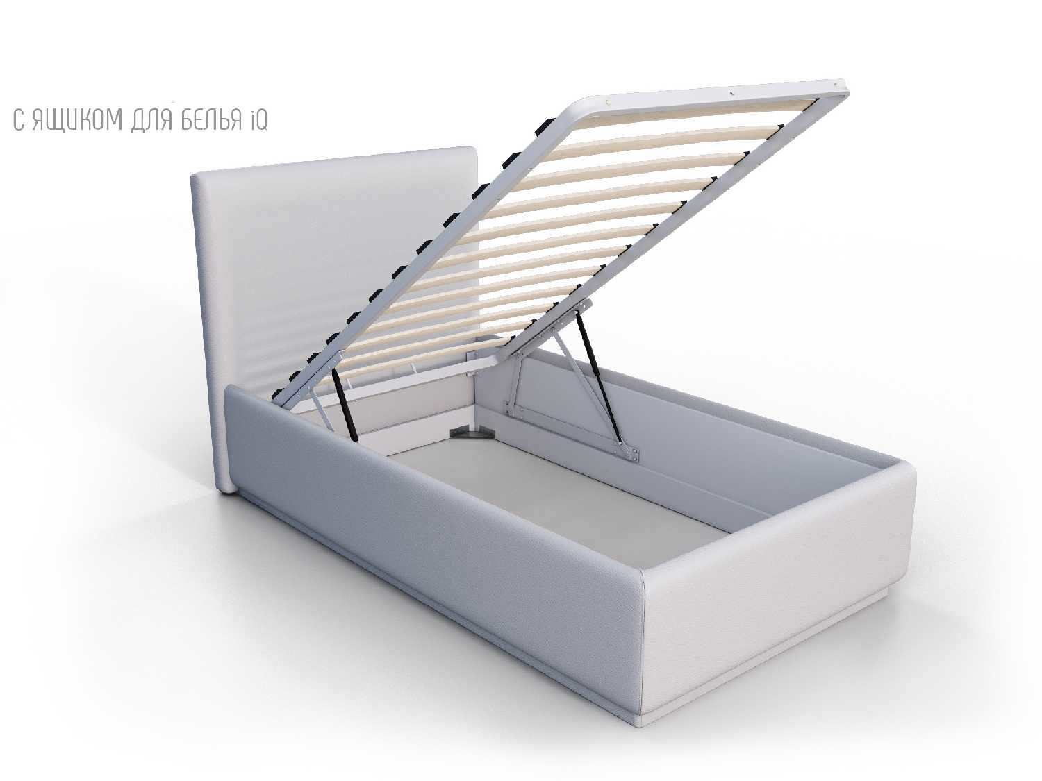 Кровать укомплектована IQ с подъемным механизмом и ящиком для белья без дна (дополнительная платная опция - дно к ящику IQ из HDF (ХДФ). Каркас кровати на цоколе, декоративный чехол на цоколе съёмный. Глубина ящика для белья - 30 см, без ограничения нагрузки на ящик.