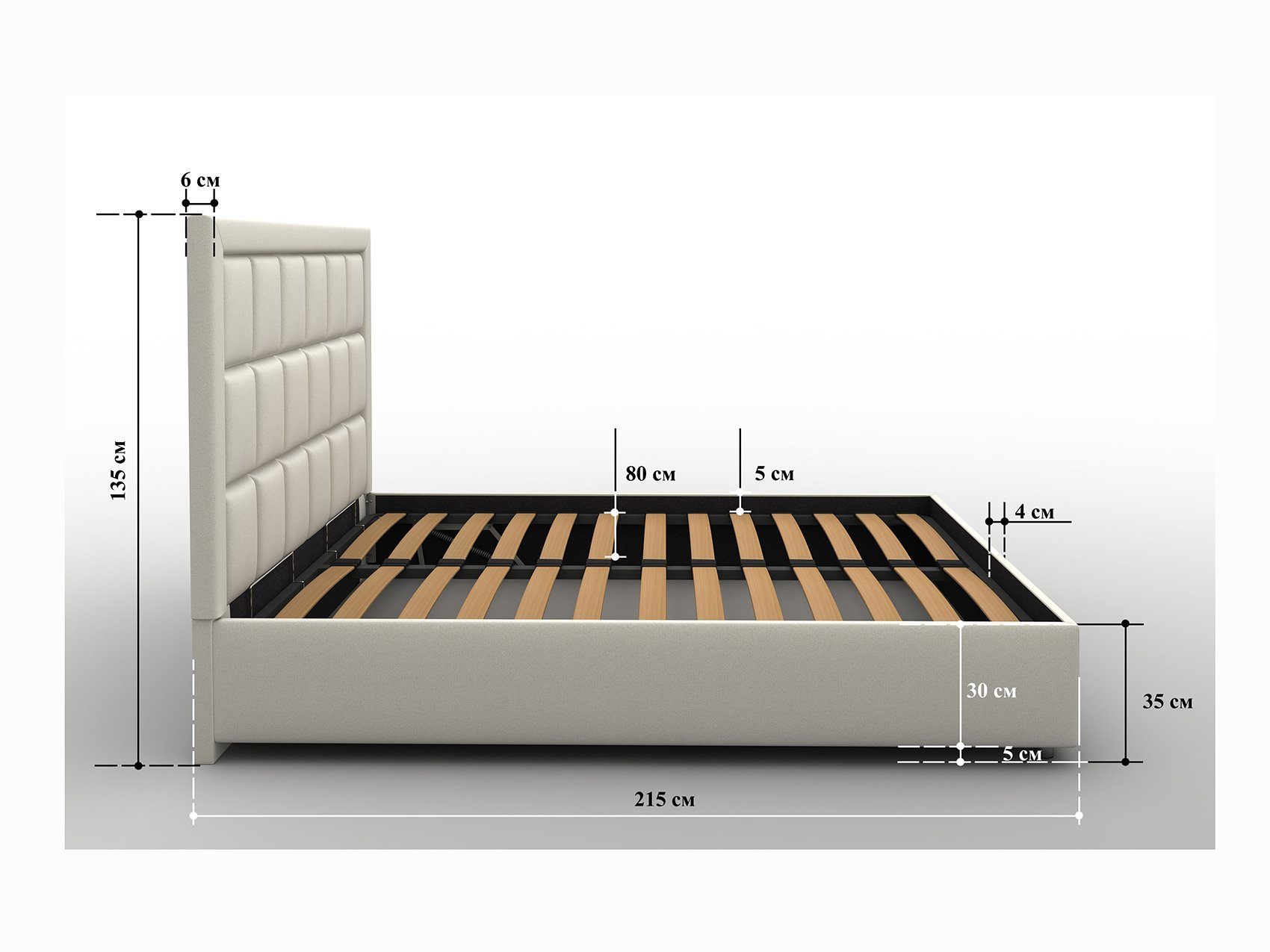Кровать оснащена подъёмным механизмом. В такой вариации основание поднимается и открывает доступ к ящику для хранения белья и других вещей. Такая система может заменить небольшой шкаф и решить вопрос с организацией пространства.