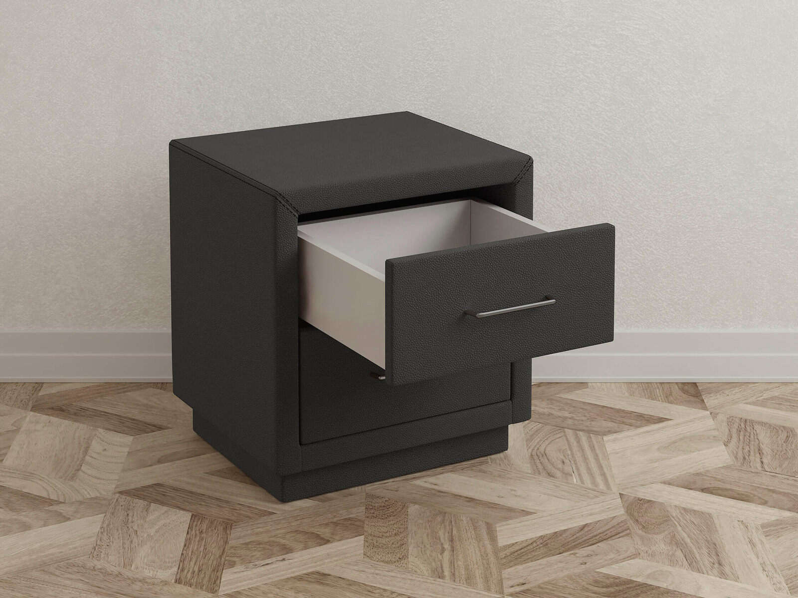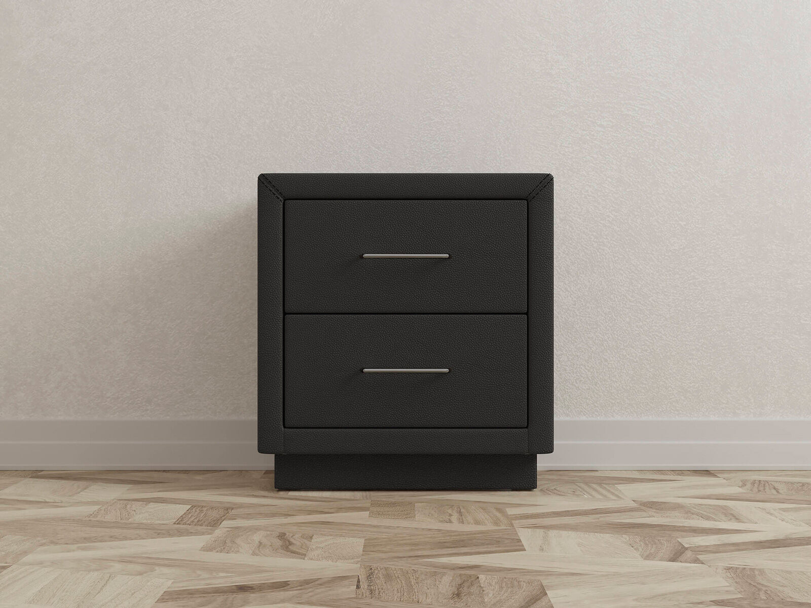 Прикроватная тумба с двумя выдвижными ящиками сочетается с любыми моделями кроватей, органично вписывается в интерьер практически любого стиля. Каркас тумбы выполнен из ДСП. Каркас тумбы и фасад ящиков покрыты обивочным материалом. Для удобства использования и продления срока эксплуатации, рекомендуется использовать стеклянную накладку. Накладка используется в качестве столешницы для тумбы и защищает ее от повреждений и загрязнений. Стеклянная столешница заказывается дополнительно