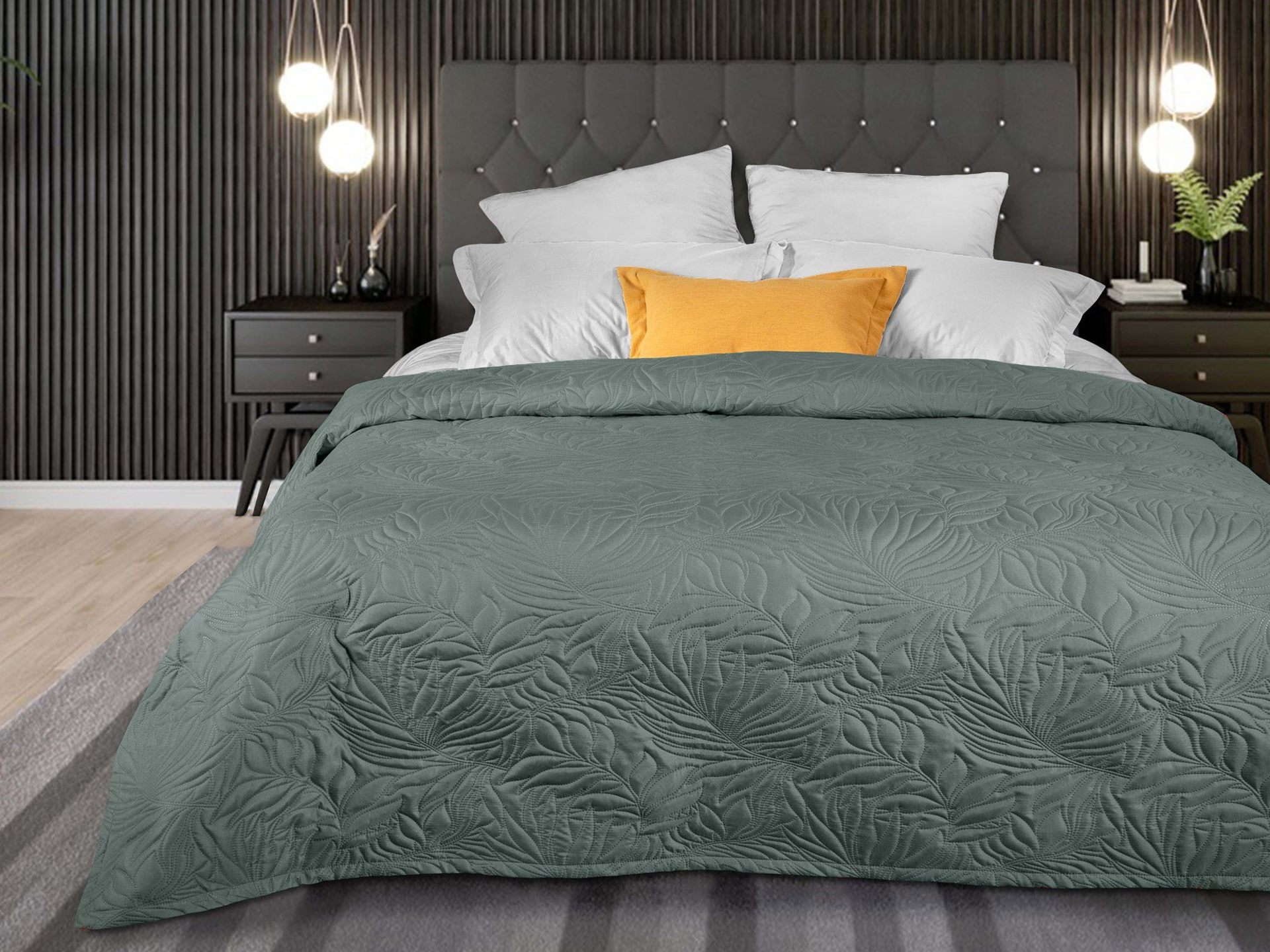 Покрывало Arti с оригинальной стежкой Листья в элегантном графитовом цвете будет хорошо смотреться со многими цветами, особенно в сочетании с акцентами ярких цветов. Покрывало выполнено из современной ткани Биософт™ с бархатистой фактурой. Ткань не только приятная на ощупь, но и очень практичная. Благодаря ей покрывало обладает хорошей гигроскопичностью, хорошо сохраняет форму и быстро сохнет. Изделие изготовлено по уникальной технологии безниточной стежки Ультрастеп™, которая придает ему особую прочность и продлевает срок службы. Современный дизайн стежки в сочетании с благородными цветами идеально впишется в интерьер Вашей спальни.