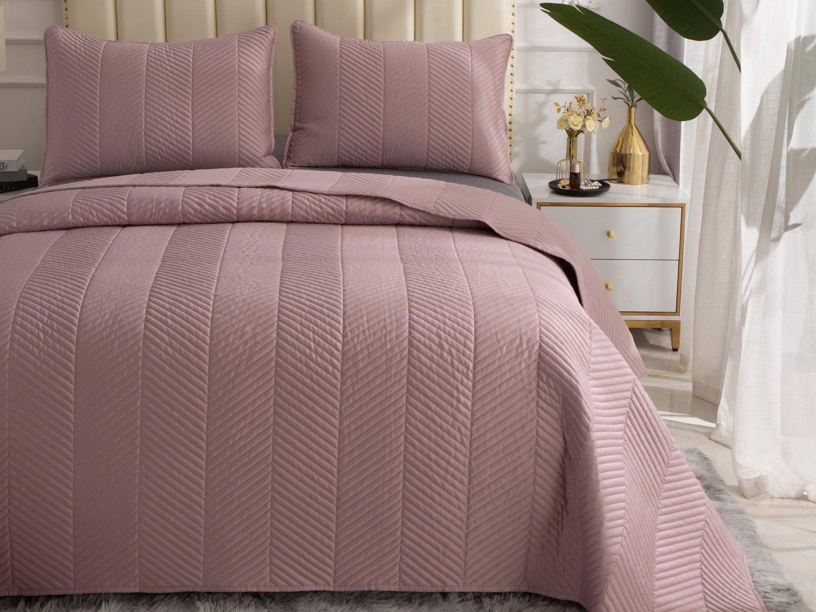 Стёганое дышащее покрывало Адонис на 70% состоит из хлопка и на 30% из вискозы. Ткань изделия гладкая и приятная на ощупь. Декоративный кант и ритмичный «елочный» рисунок, выступающий над поверхностью, придают покрывалу игривый утонченный вид.