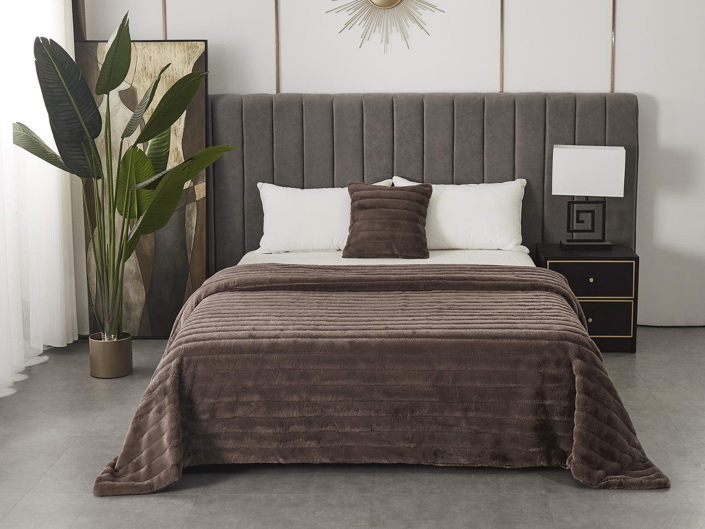 Уютный плед из искусственного меха – незаменимая многофункциональная вещь интерьере. Его можно использовать по-разному, например, положить на кровать в спальне, на диван или кресло в гостиной. Мягким пледом можно укрываться, используя его как одеяло, а можно расстелить на полу. Подушки в наволочках, подобранные в тон, дополнят интерьер.