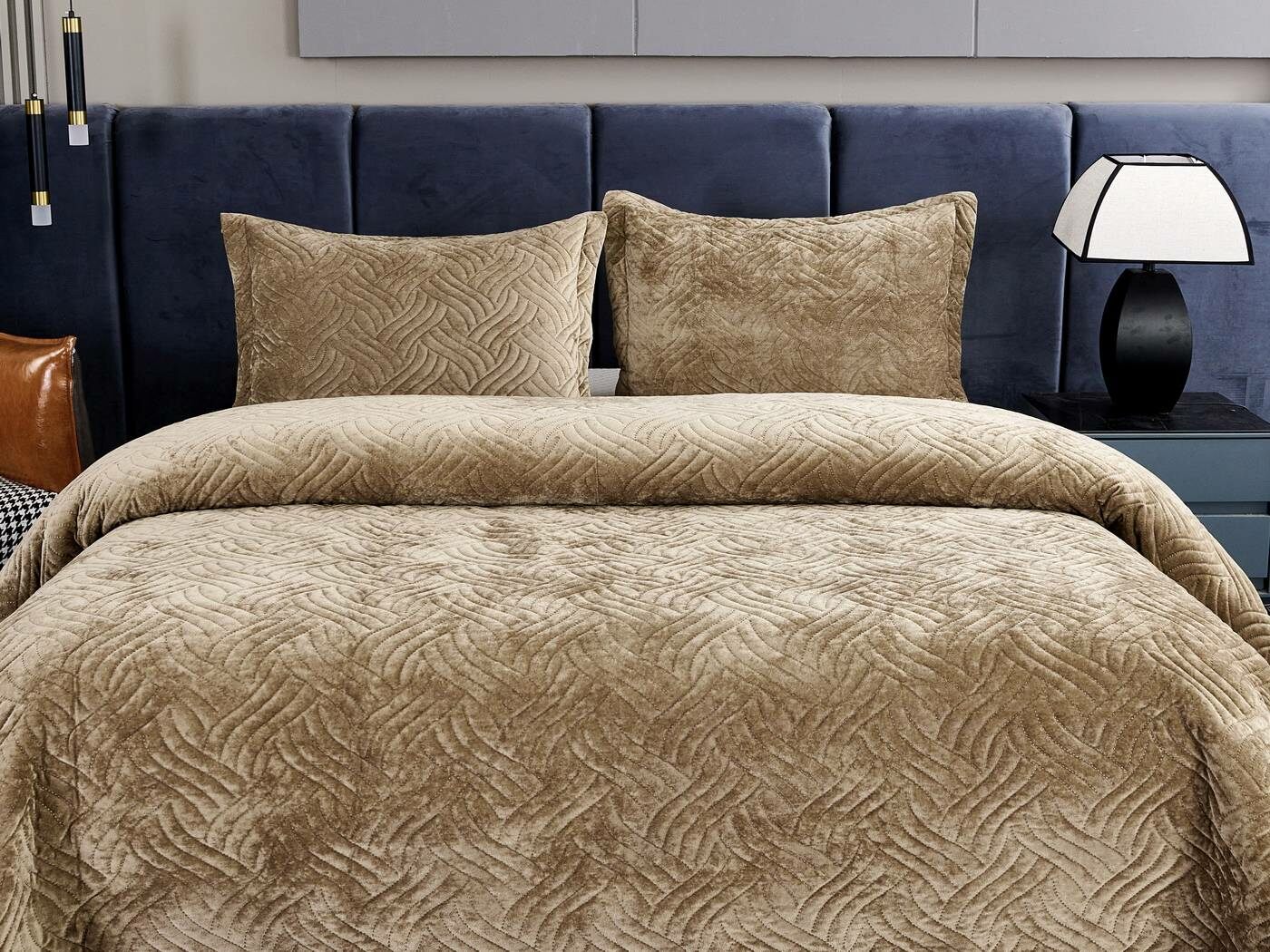 Покрывала «Деварта»: нежность и уют в вашем доме Окунитесь в мир комфорта и изысканности с новой коллекцией мягких бархатных покрывал «Деварта». Эти изделия станут настоящим украшением вашей спальни, добавив ей уюта и элегантности. Покрывала изготовлены из высококачественного бархата, который приятен на ощупь и обладает нежной бархатистой текстурой. Они устойчивы к износу и надолго сохраняют свой привлекательный внешний вид, яркость цвета и мягкость. Благодаря прочной и качественной декоративной стёжке «косичка» наполнитель надёжно зафиксирован внутри изделия. «Деварта» представлена в пяти оттенках: от тёплого бежевого до спокойного серо-голубого. Вы сможете подобрать идеальный вариант для вашего интерьера. Размерный ряд включает два варианта, что позволяет выбрать покрывало, которое идеально подойдёт для вашей кровати или дивана. В комплект входят две наволочки размером 50х70 см. Каждое покрывало аккуратно обшито кантом, а наволочки украшены милыми ушками шириной 5 см. Это придаёт изделиям особый шарм и делает их ещё более привлекательными. Не упустите возможность приобрести эти замечательные покрывала и создать в своём доме атмосферу тепла и уюта. «Деварта» подарит вам не только эстетическое наслаждение, но и незабываемые ощущения при каждом прикосновении.