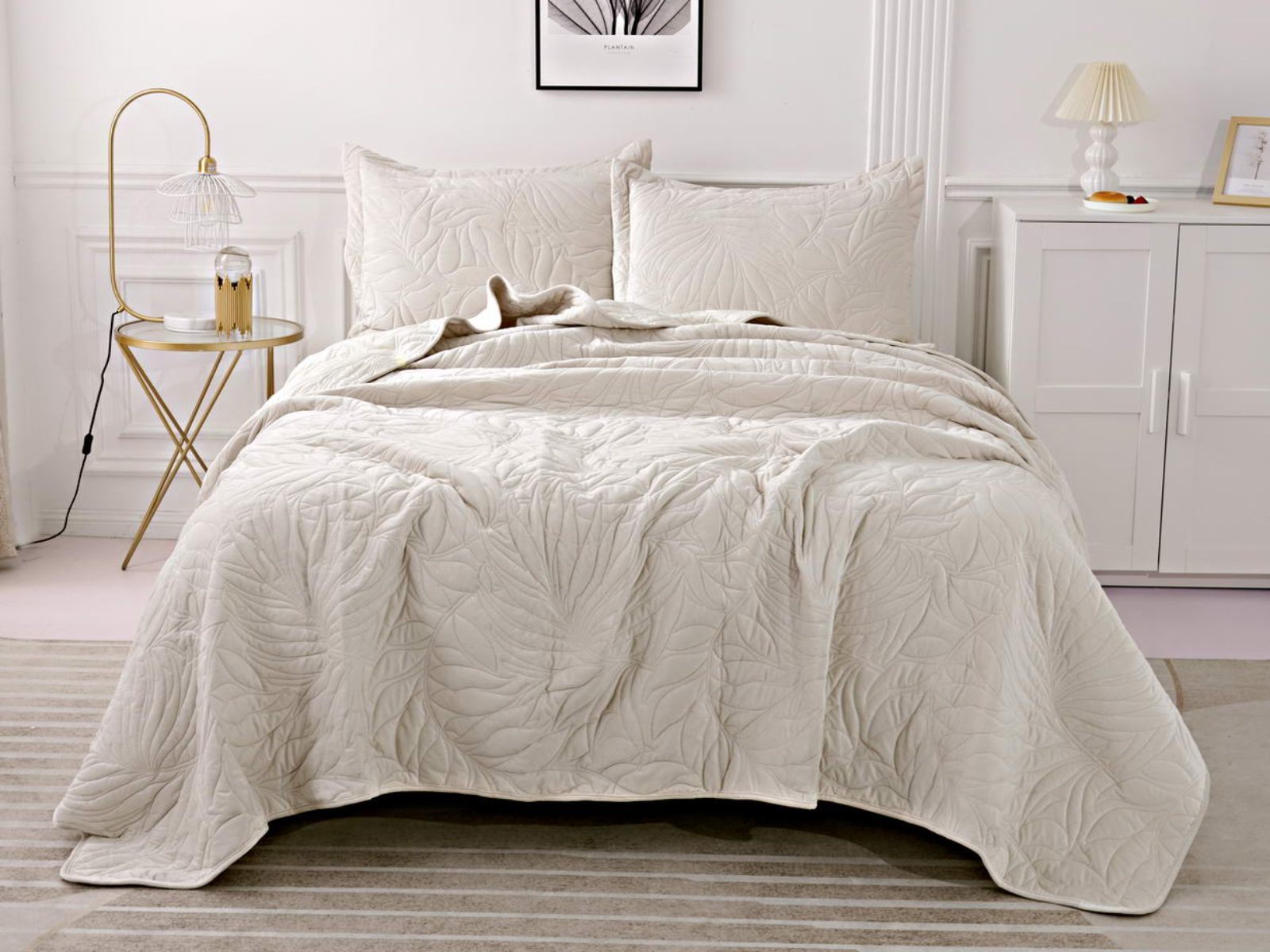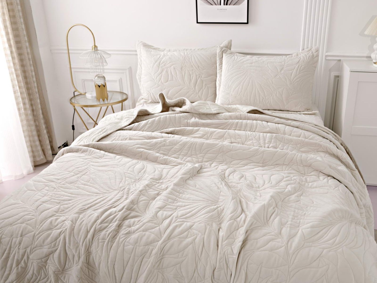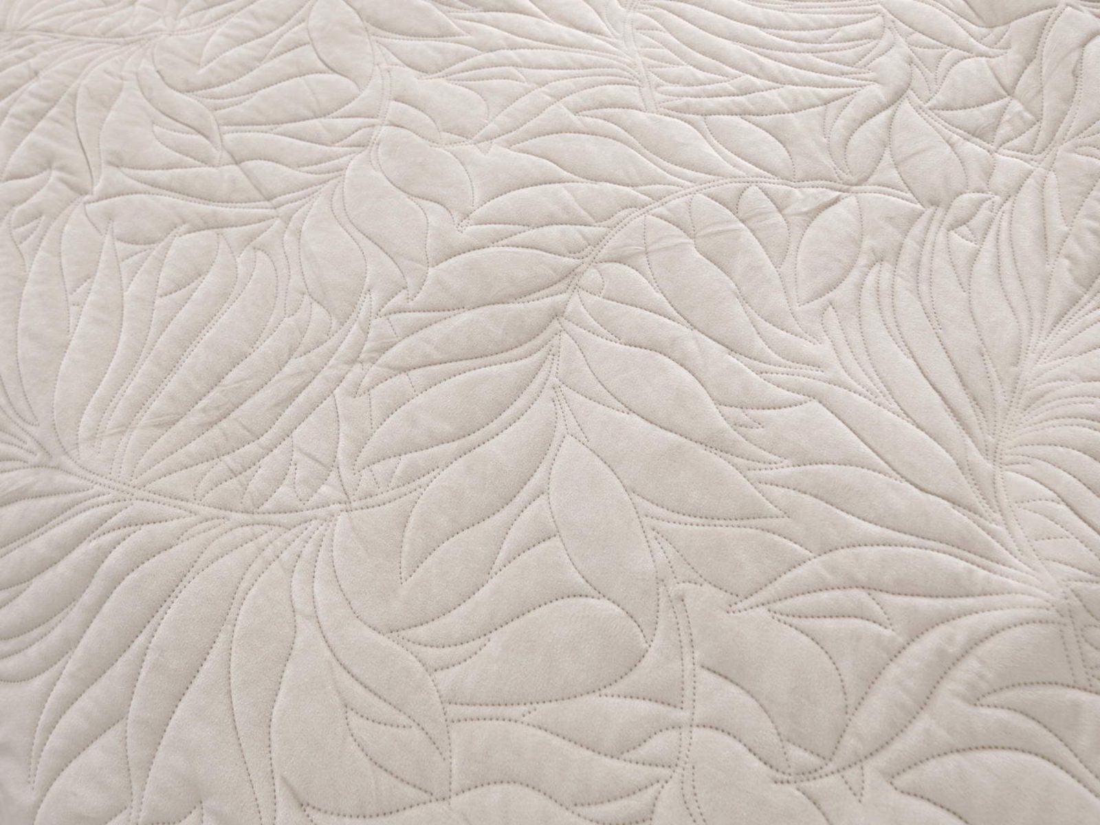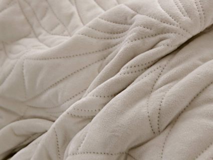 Стёганое покрывало Глория изготовлено из 100% вискозы, что делает его невероятно мягким и комфортным. Рисунок напоминает листья лавра. Такой орнамент подойдет большинству современных интерьеров.
