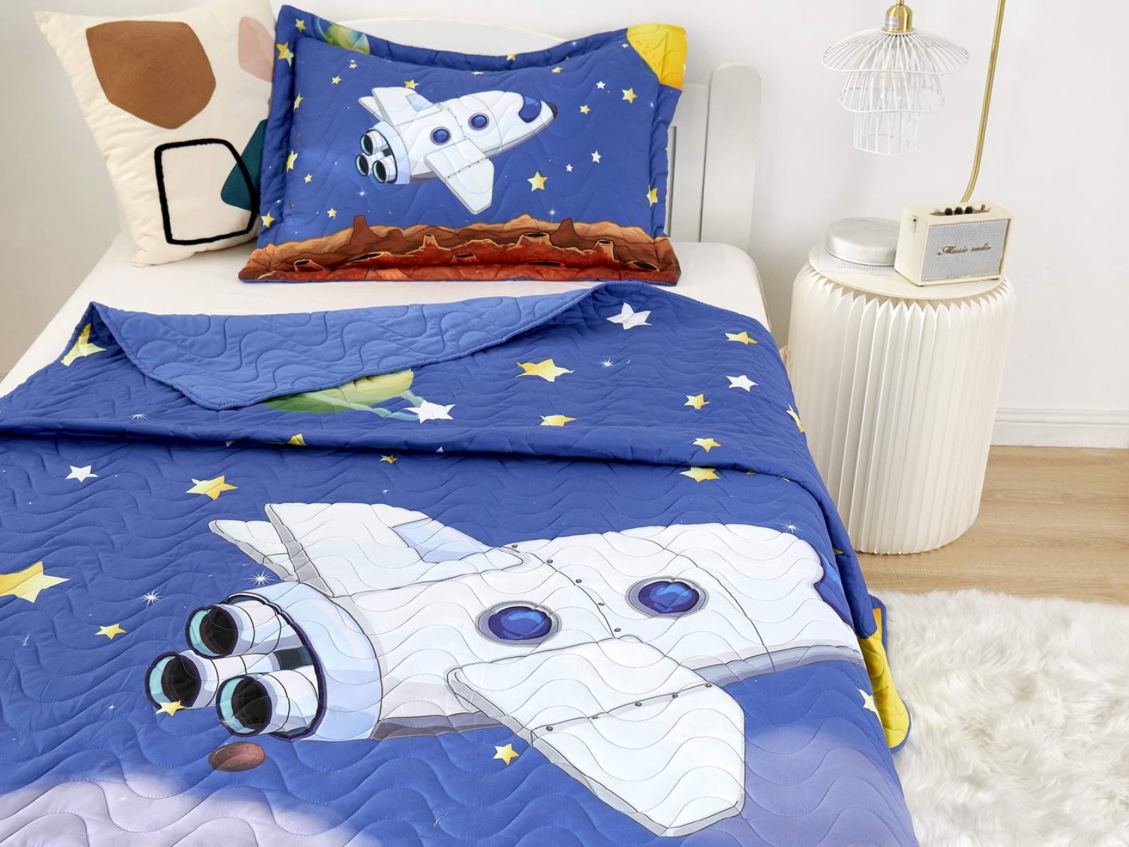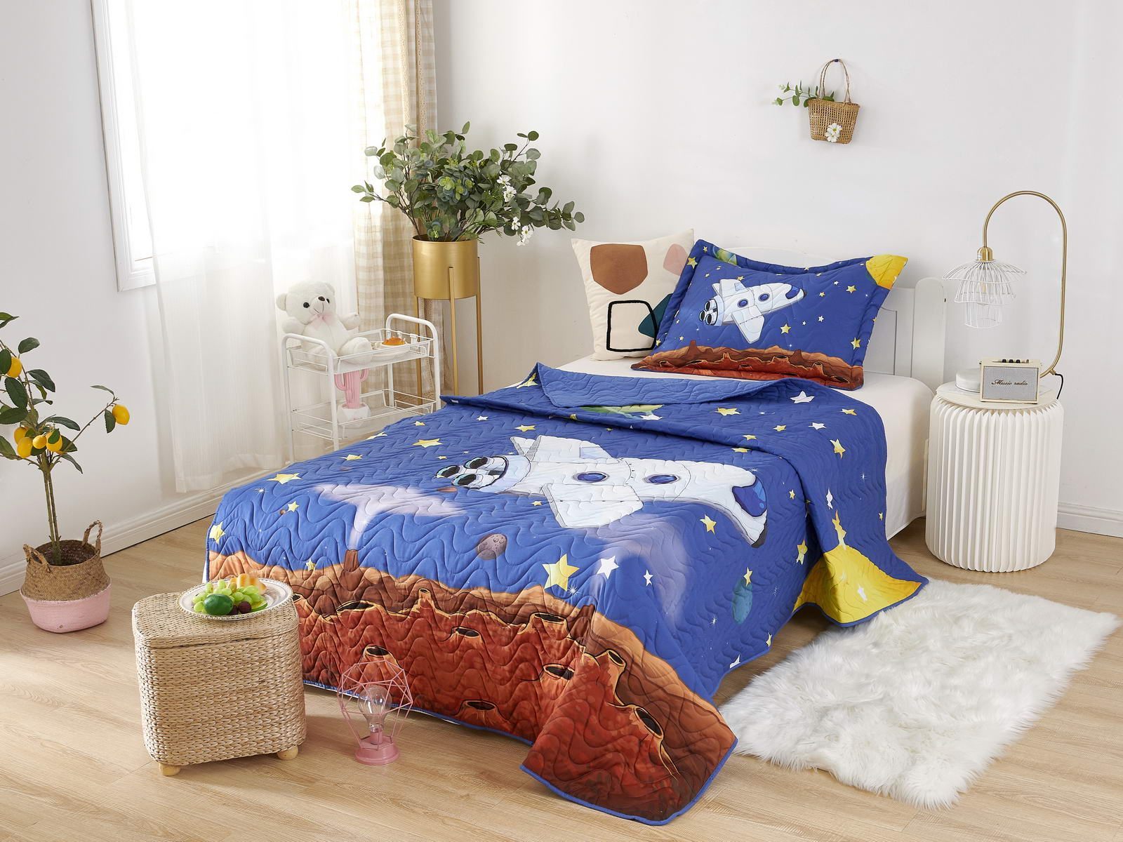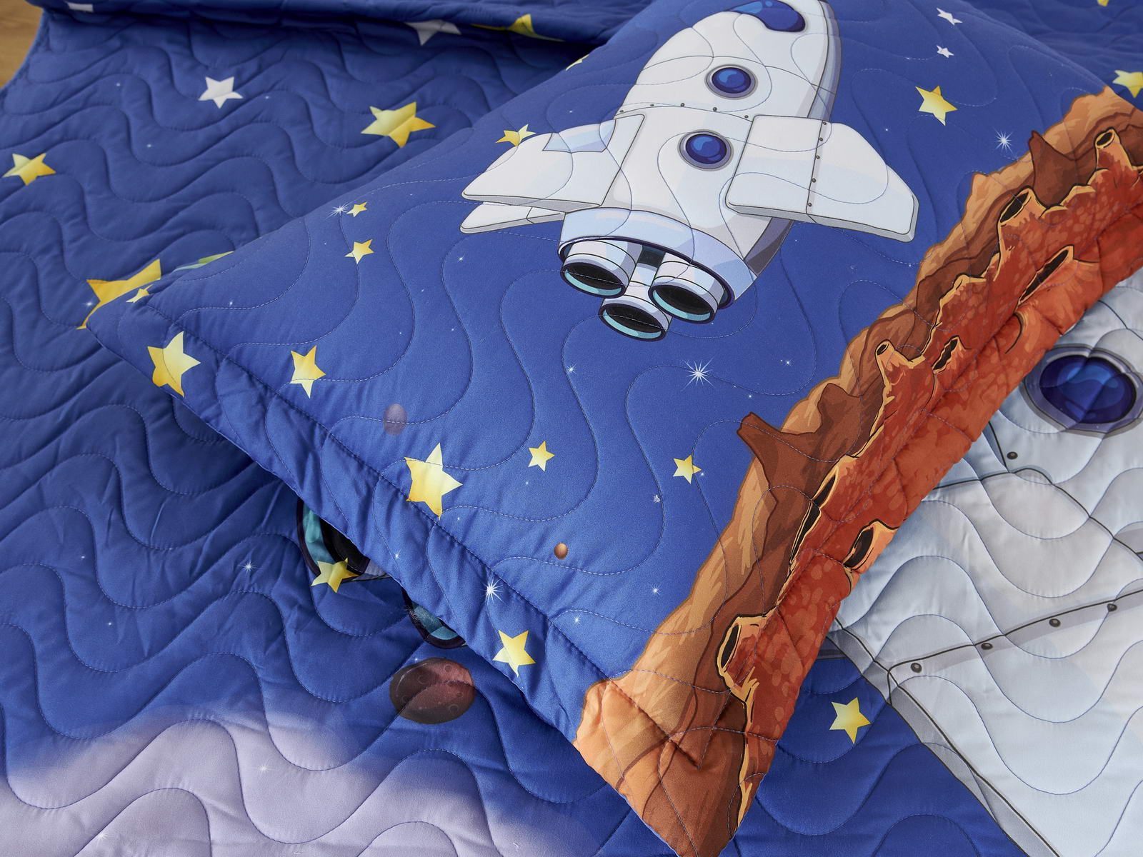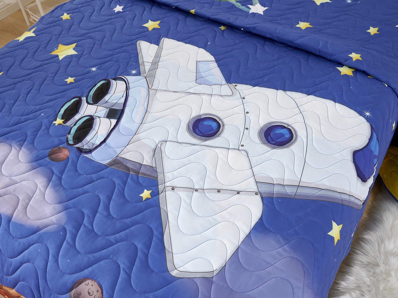Детские покрывала - это особая забота об уюте и комфорте ребенка. Красивое, стеганое покрывало коллекции «Sunny day» придаст любой детской спальне яркую индивидуальность. Волнистые стежки делают изящные покрывала еще более выразительными и изящными. К ним в комплекте идут наволочки, у них есть интересная особенность, которая непременно понравится ребенку– небольшие ушки.