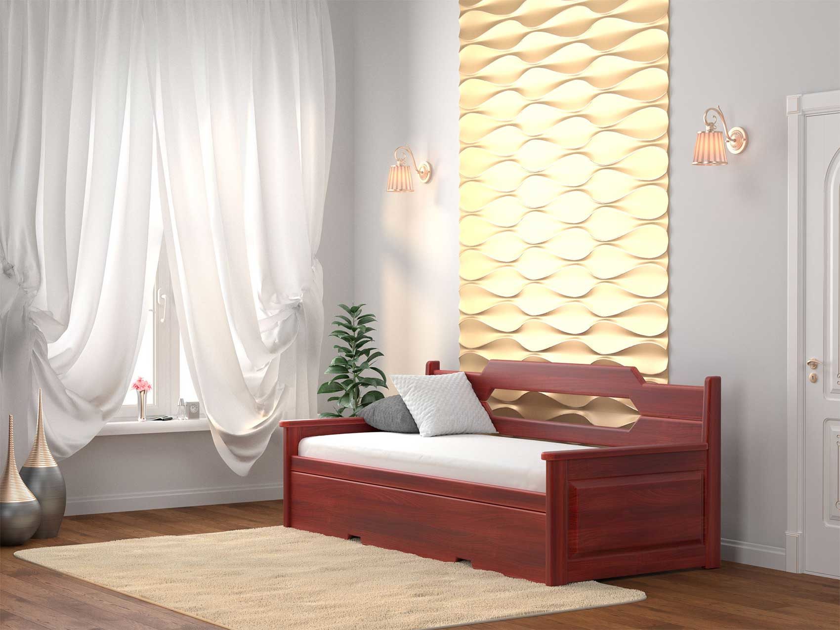 Воплощение практичности и надежности спального места. Модель выполнена из 100% массива благородных пород древесины и легко трансформируется из односпальной кровати в двухспальную кровать с полноценными ортопедическими матрасами высотой до 14 см. каждый. Размер одного спального места (в сложенном состоянии) – 80 см. в ширину и 200 см. в длину, а размер второго (шагающая часть) - 73 см. в ширину и 190 см. в длину. Высота боковых поручней - 58,5 см. Высота задней спинки 87 см. Высота "изножья" с лицевой стороны - 37 см. Внешние габариты: 10 см. к длине и 14 см. к ширине. В разложенном состоянии габариты кровати составляют 160 см. в ширину и 212 см. в длину. Требуется сборка.