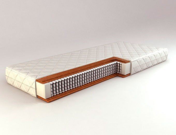 Толщина плиты 10 мм. В матрасе используется по 2 плиты с обеих сторон. Латексная пропитка необходима для предотвращения расслаивания койры в процессе эксплуатации матраса. Этот материал является самым жестким наполнителем, используемым в производстве ортопедических матрасов. В качестве изолирующего слоя предохраняющего кокос от воздействия пружин используется спанбонд.